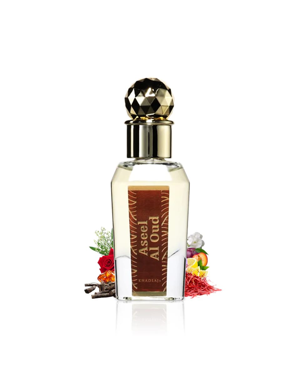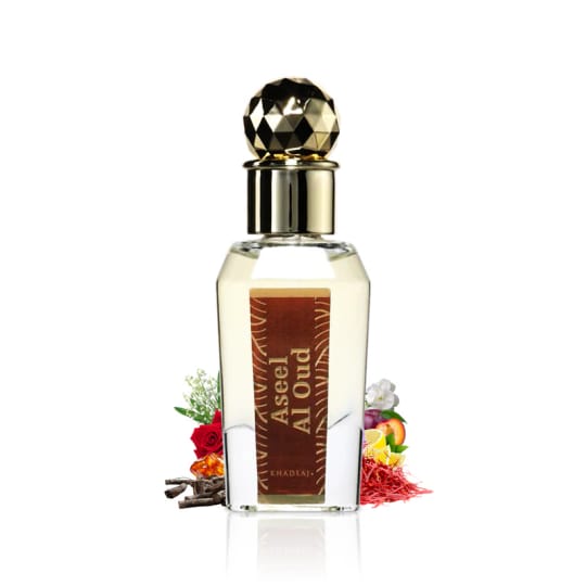 Khadlaj ASEEL AL OUD Парфюмно масло Ароматни нотки: Връхни нотки: шафран, слива, лимон. Средни нотки: роза, момина сълза, жасмин. Базови нотки: кехлибар, дървесни нотки, кедрово дърво.