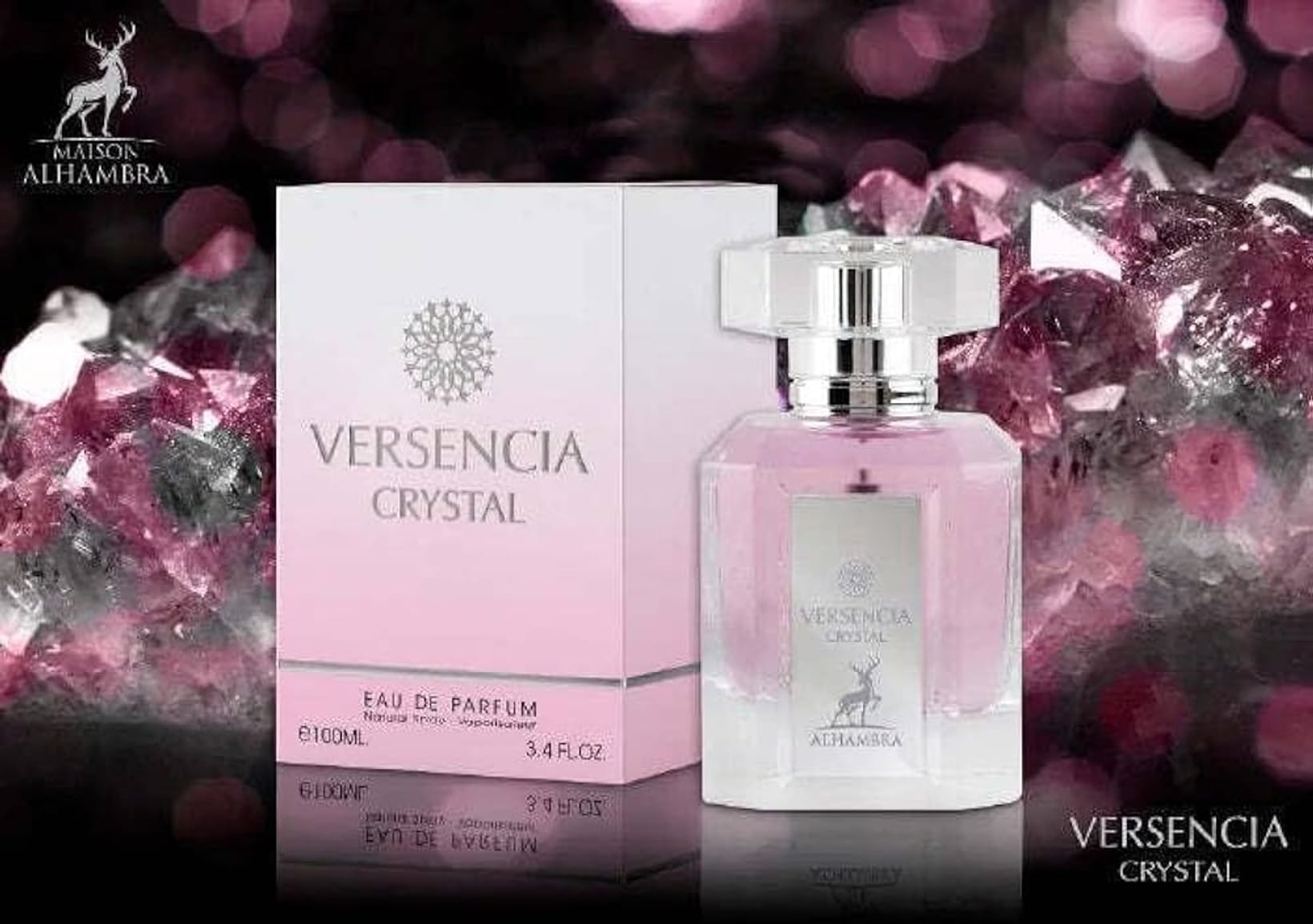 Представен на пазара: 2000 Марка: Alhambra Серия: versencia crystal Група продукти: парфюмни води Класификация: мас маркет Обем: 100 ml Държава производител: ОАЕ Направено в: ОАЕ Пол: за жени Тип аромат: дървесни, флорални Връхни нотки: Нар, Юзу Средни нотки: Божур, Лотос, Магнолия Базови нотки: Амбър